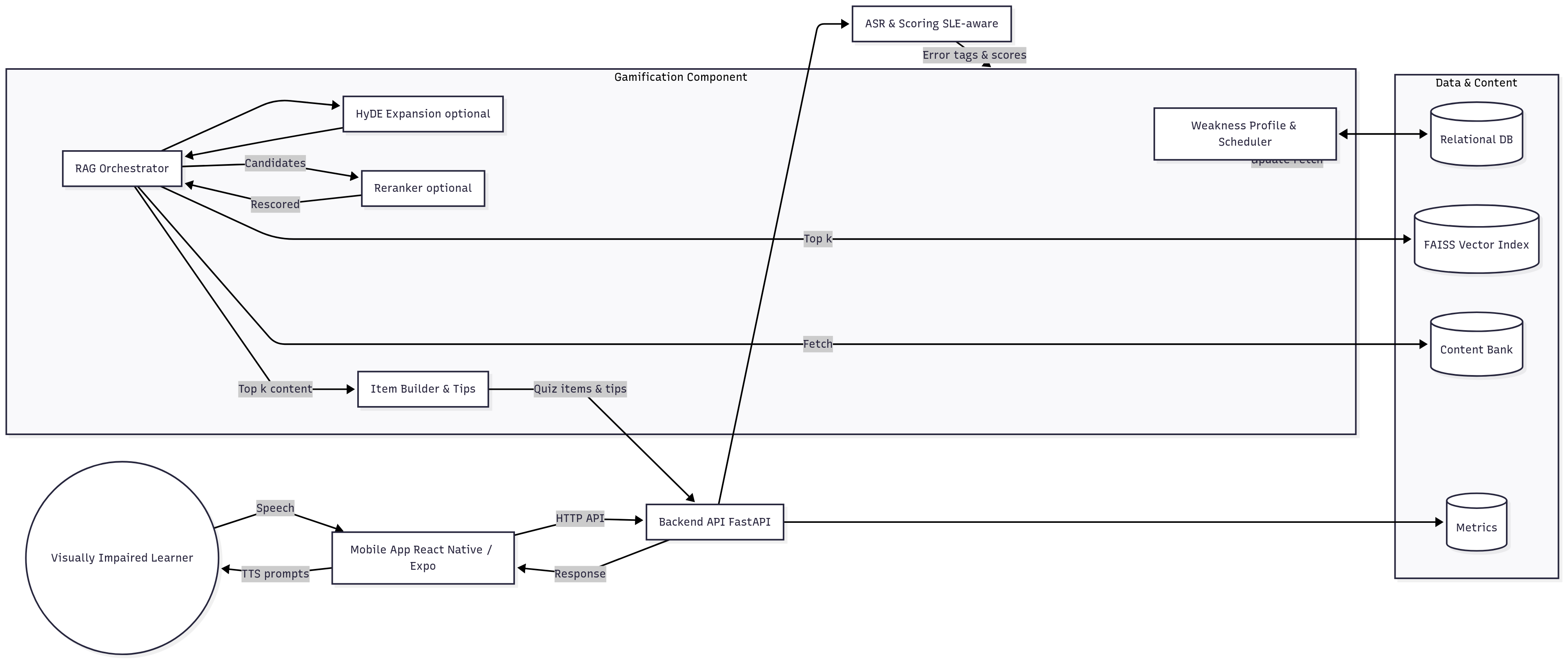 The main objective of this research is to design, develop, and evaluate an audio-only, conversational, and gamified English language learning system tailored for visually impaired Sri Lankan learners. The system aims to provide accent-aware pronunciation support, context-sensitive grammar correction, and interactive quiz-based practice, all delivered through fully accessible, speech-first interfaces. By focusing on accessibility, cultural relevance, and privacy, the solution seeks to empower learners to practice independently, build confidence in spoken English, and achieve measurable educational outcomes under real-world resource constraints such as limited connectivity and mid-range devices.