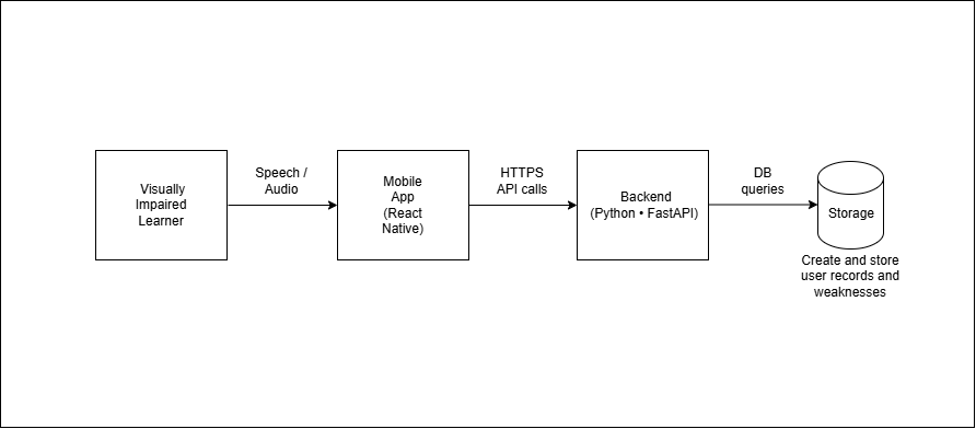 We will then train and fine-tune speech and language models for phoneme recognition, pronunciation scoring, and grammar correction, and implement these in a React Native + FastAPI application designed with accessibility-first principles. Usability testing and iterative prototyping will be conducted to refine the system. Finally, learning outcomes will be evaluated through pre- and post-test comparisons, usage analytics, and learner feedback to ensure effectiveness and continuous improvement.
